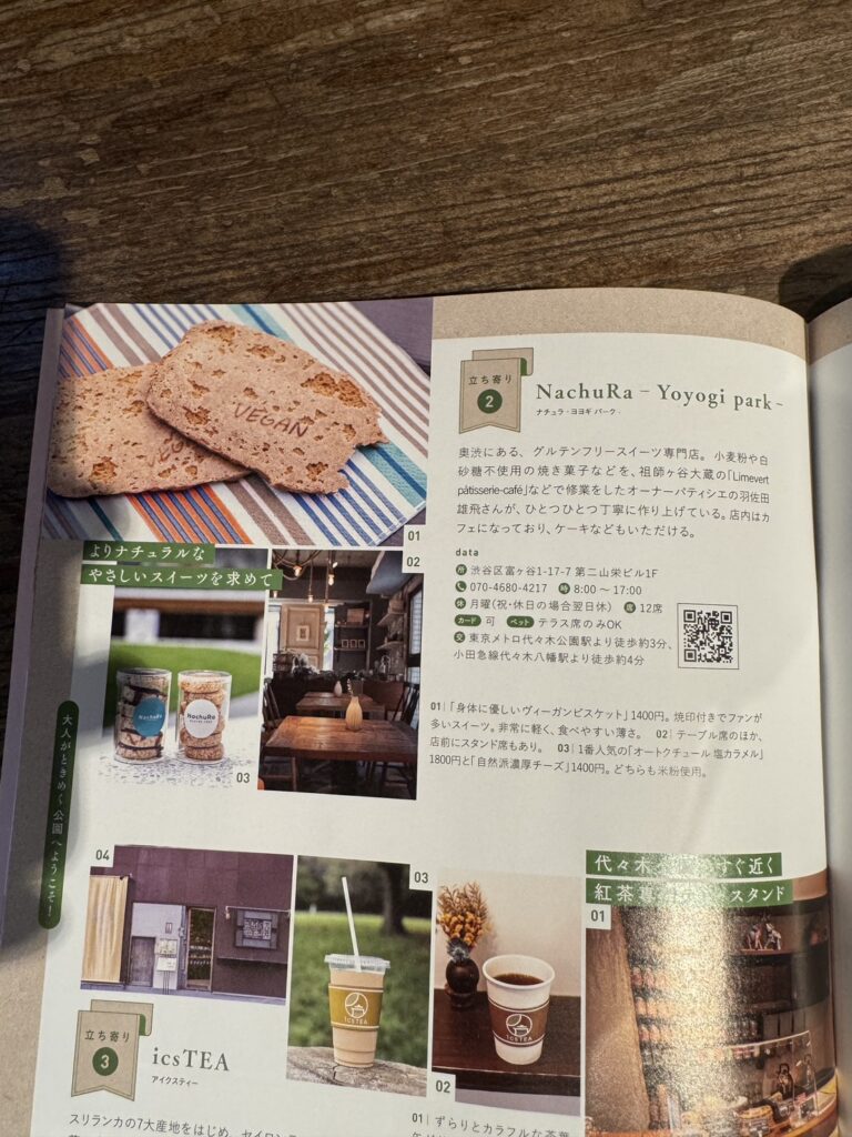 本誌では、代々木公園エリアの散策スポットのひとつとして、NachuRaのグルテンフリースイーツや店舗の雰囲気を取り上げていただいております。